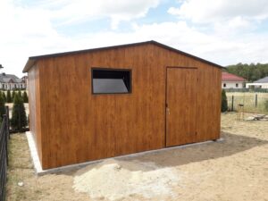 Blaszany domek ogrodowy 6×5 | dwuspadowy | kolor drewnopodobny multigloss + RAL8017 brąz