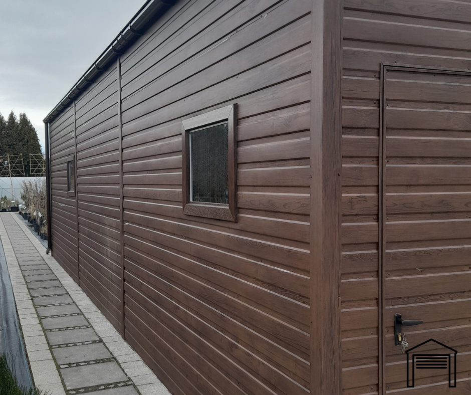 Hala magazynowa 5×10 | dwuspad | PROFIL ZAMKNIĘTY | kolor RAL 8017 MAT+ drewnopodobny ORZECH