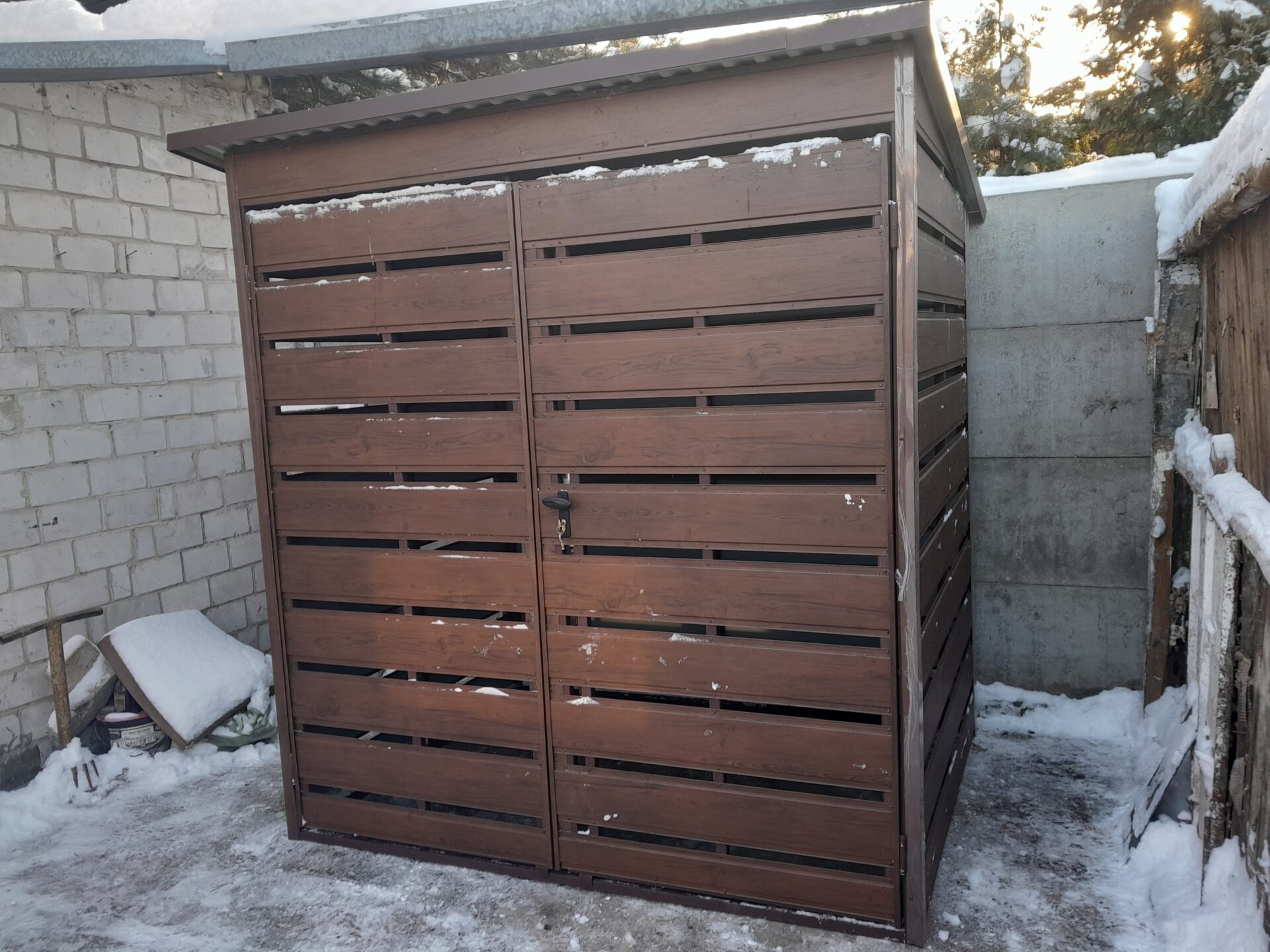 Wiata śmietnikowa panelowa 2×1 | PROFIL ZAMKNIĘTY | kolor drewnopodobny orzech