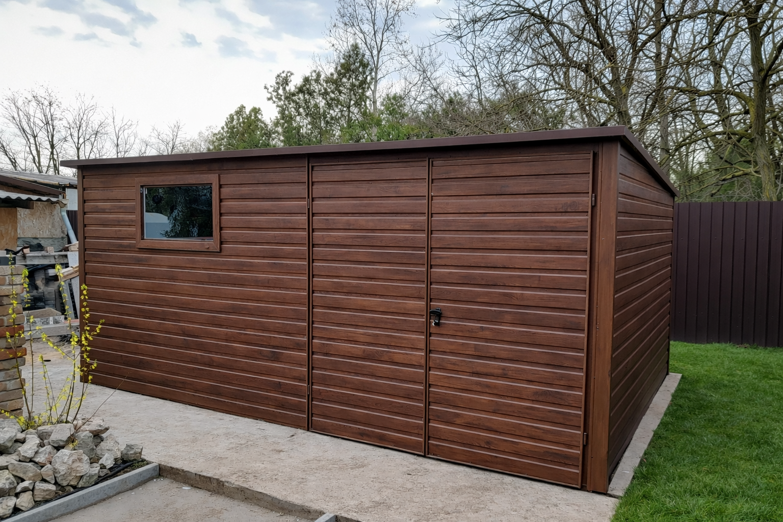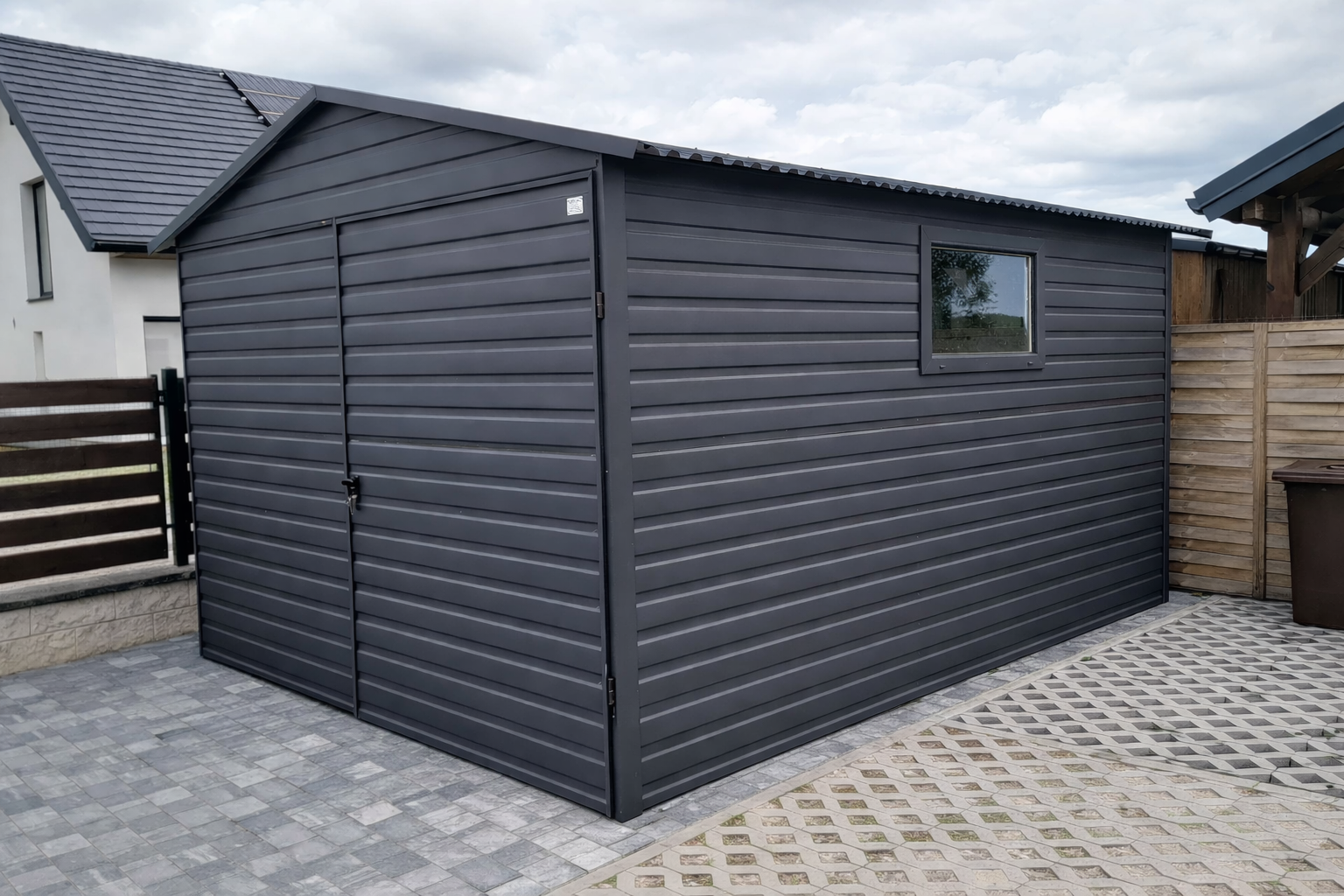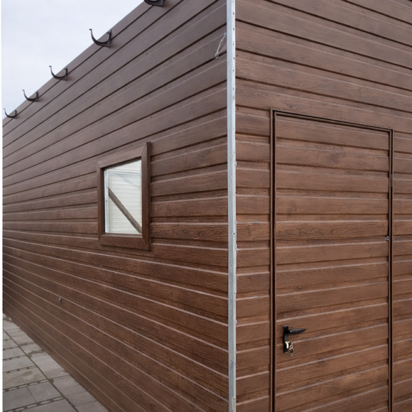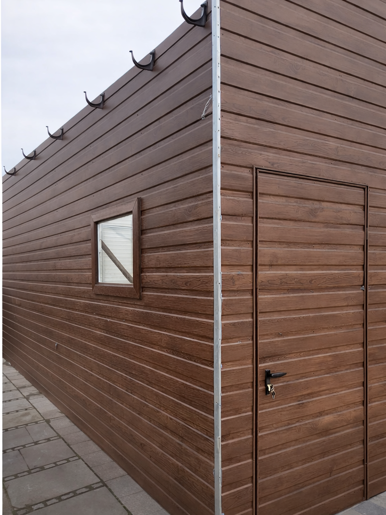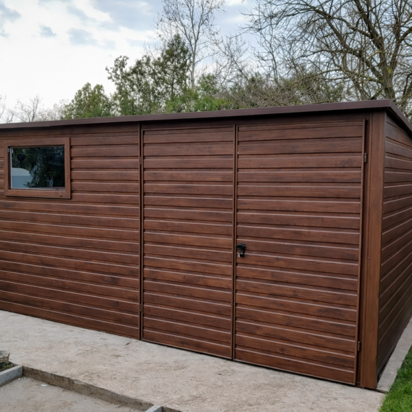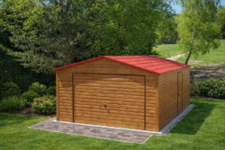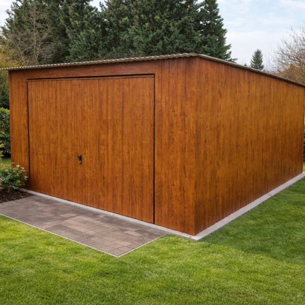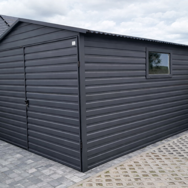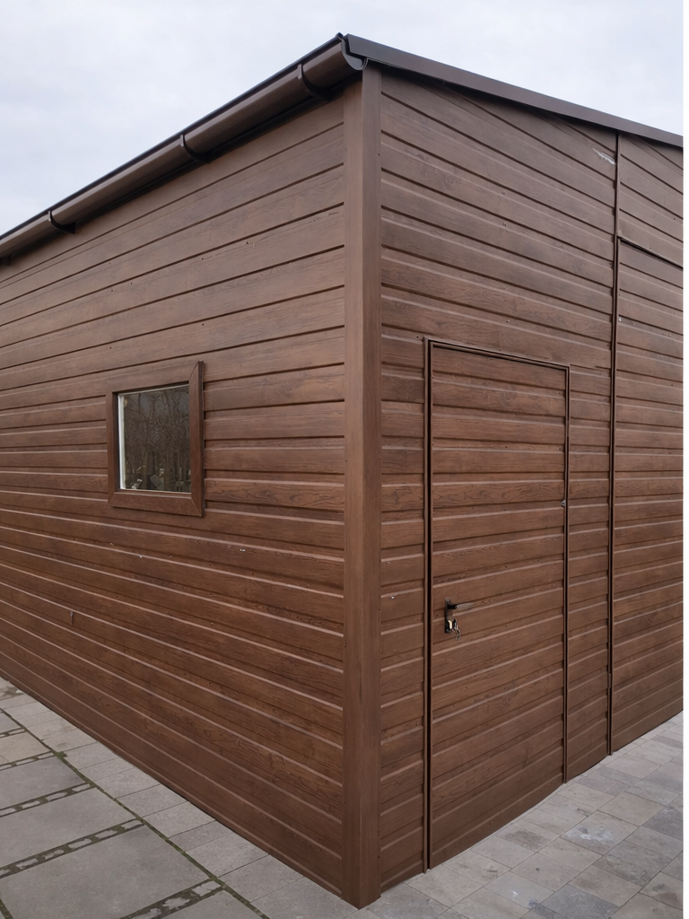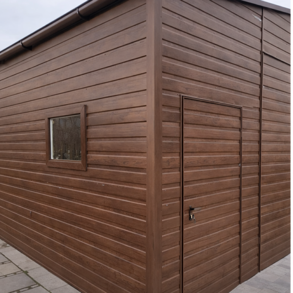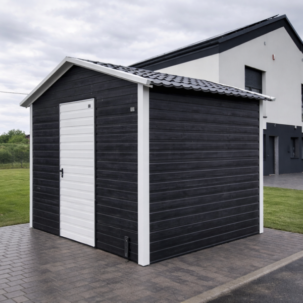 Pierwszy rodzaj to okucia narożne, maskujące łączenie ścian na rogach garażu. W przypadku garaży wykonanych w klasycznym stylu, czyli z pionowym ułożeniem paneli blachy stanowią one jedynie dodatek czysto estetyczny, który znacząco poprawia wygląd ale nie jest konieczny do zwykłego użytkowania garażu. Szczególnie polecamy tą opcję dodatkową w przypadku konfiguracji kolorystycznej garażu, która silnie kontrastuje z kolorem konstrukcji (srebrnym/ocynk) widocznej na rogach lub koło bramy (nadproże, słupki). Poniżej przykładowe zdjęcie garażu z obróbkami rogowymi oraz bez obróbek: