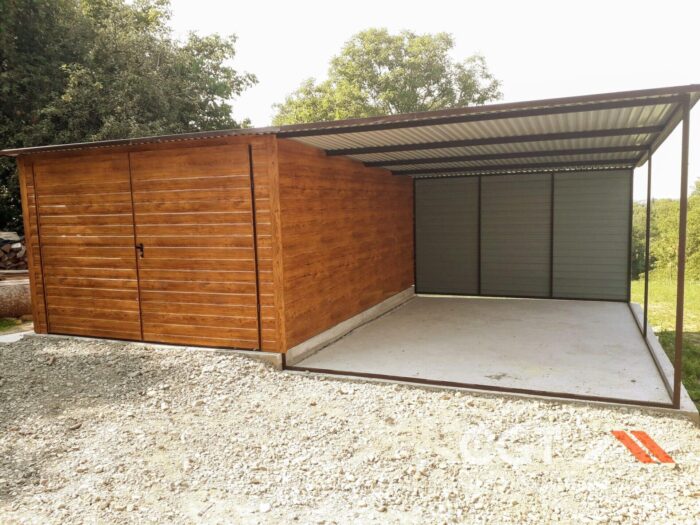 Garaż blaszany 3×5 | spad dachu na bok | kolor drewnopodobny multigloss + RAL8017 brązod Pierwotna cena wynosiła: 4.510zł.4.090złAktualna cena wynosi: 4.090zł. Sprawdź